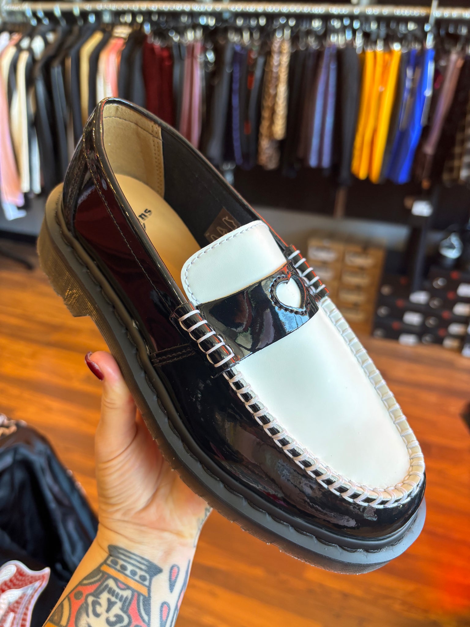Wear your heart on your shoe. The Penton Heart loafer adds a playful cut-out to a DM’s classic. Wrapped in Patent Lamper leather for a high-shine finish. And Smooth leather across the apron with a cut-out heart on the contrasting saddle. We bordered the apron with standout stitching, while adding subtle black stitching around the welt. The loafer sits on a smoke DMS sole with classic grooving.