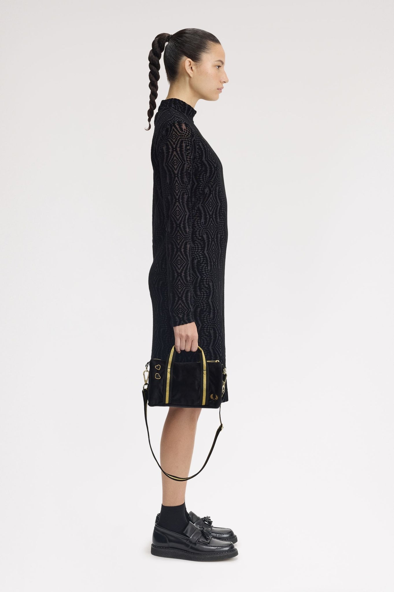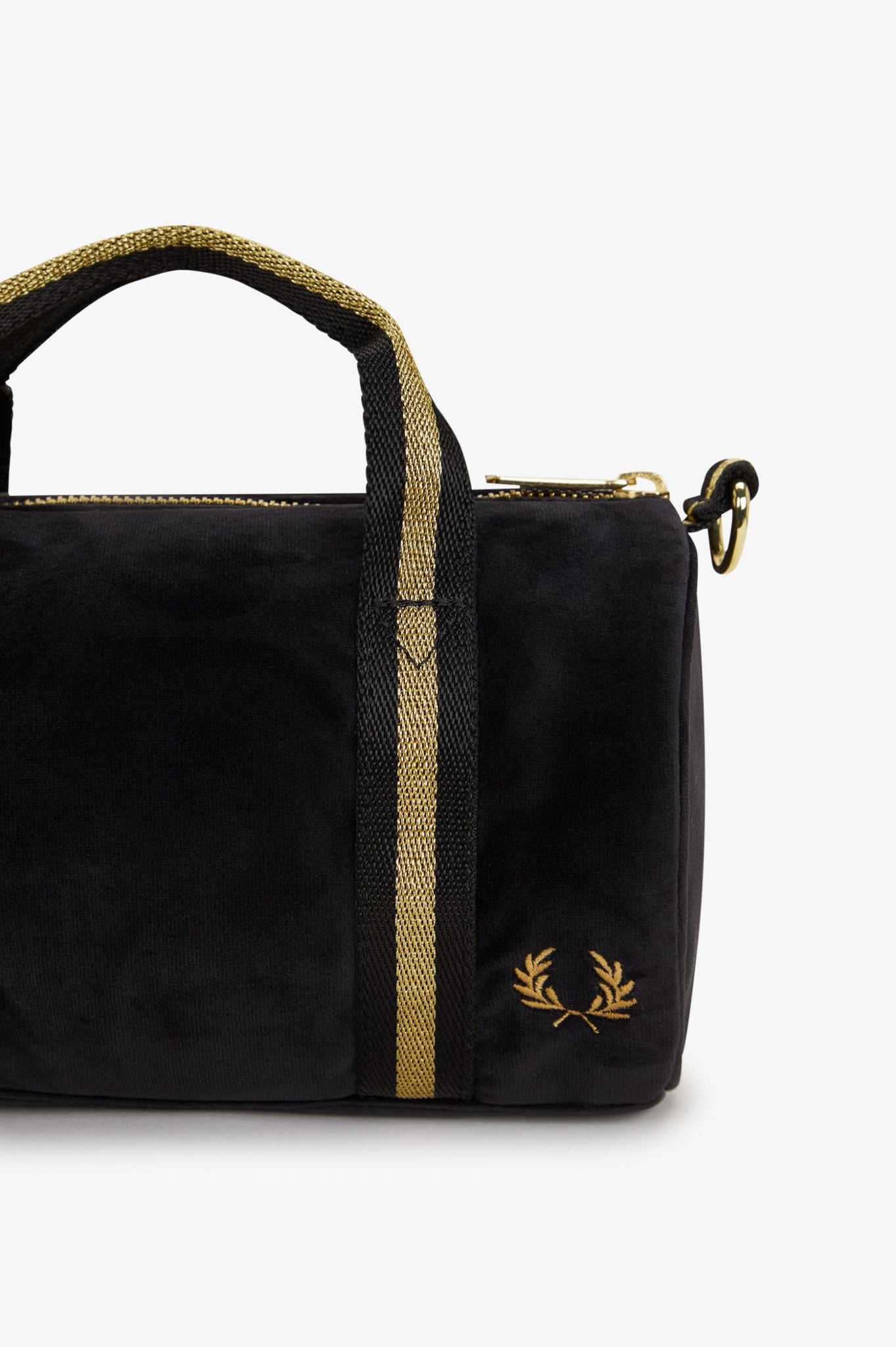 Don't judge our mini barrel bag by its size. Crafted in an elevated velour fabric with gold embroidered accents, this is an enduring wardrobe staple that will stay on your side no matter how late the night gets. 20% of the net revenue received by Fred Perry for sales of its Amy Winehouse Foundation Collection goes to the Amy Winehouse Foundation (Reg. Charity no: 1143740). In 2024, the donation amounted to £321,679, and throughout the course of our partnership we’ve donated over £2.7 million. The Amy Winehouse Foundation is a registered charity in England and Wales set up in the memory of the late singer, working to inspire children and young people to build their self-esteem and resilience, so that they can flourish.