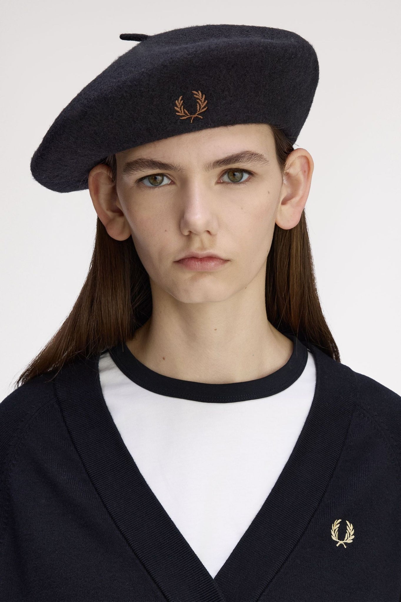 A classic wool blend beret with contrast Laurel Wreath embroidery.