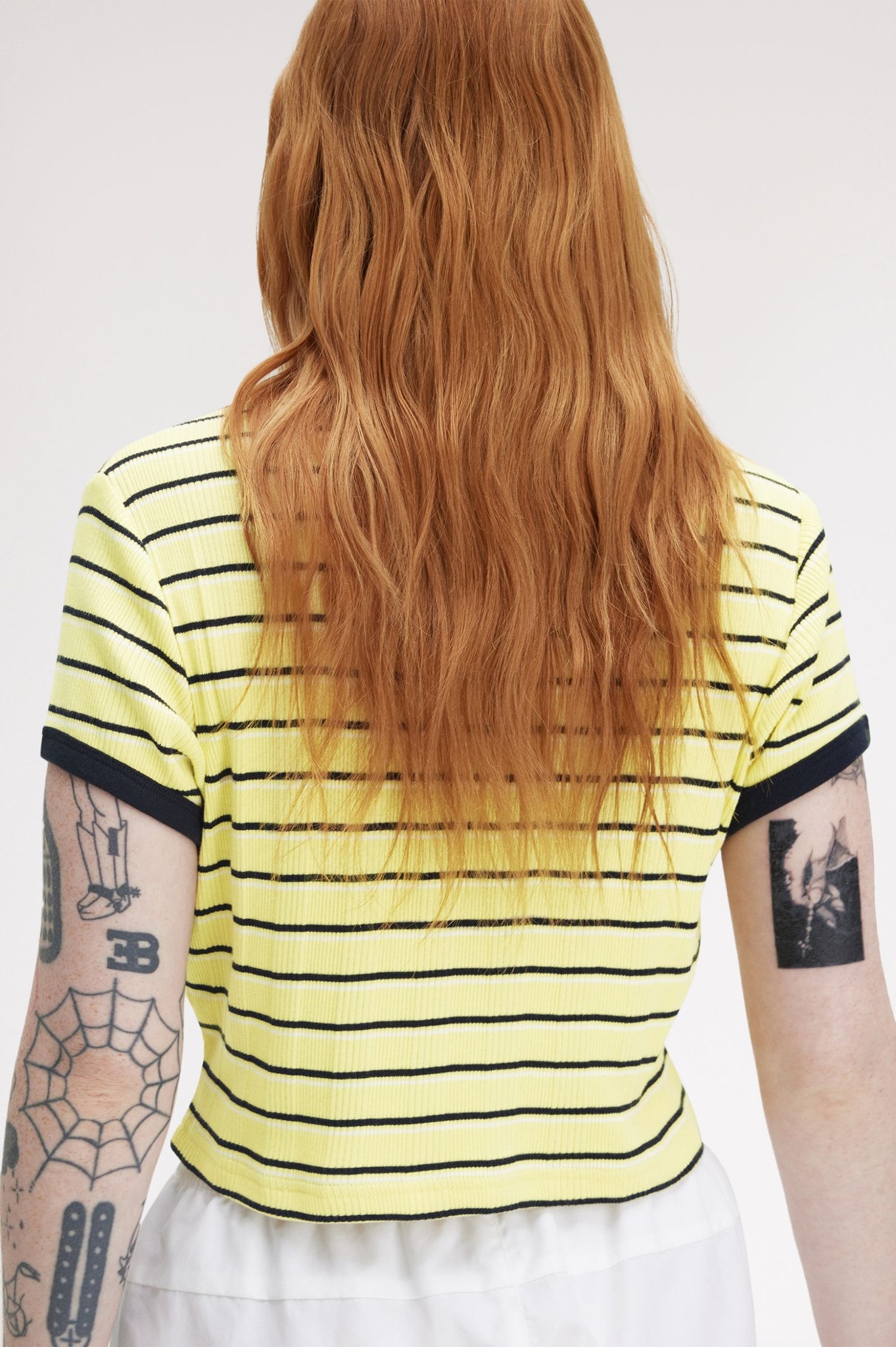 Stripes work an important job in fashion and in sport – creating visibility, structure, and borders between fabrics and field sections alike. It’s a simple detail that makes a plain outfit look instantly put together. Our striped ribbed T-shirt comes in Champion’s Gold – commemorating Fred's three consecutive Wimbledon championships. Finished with a contrasting crew neck and sleeves. Go boldly.