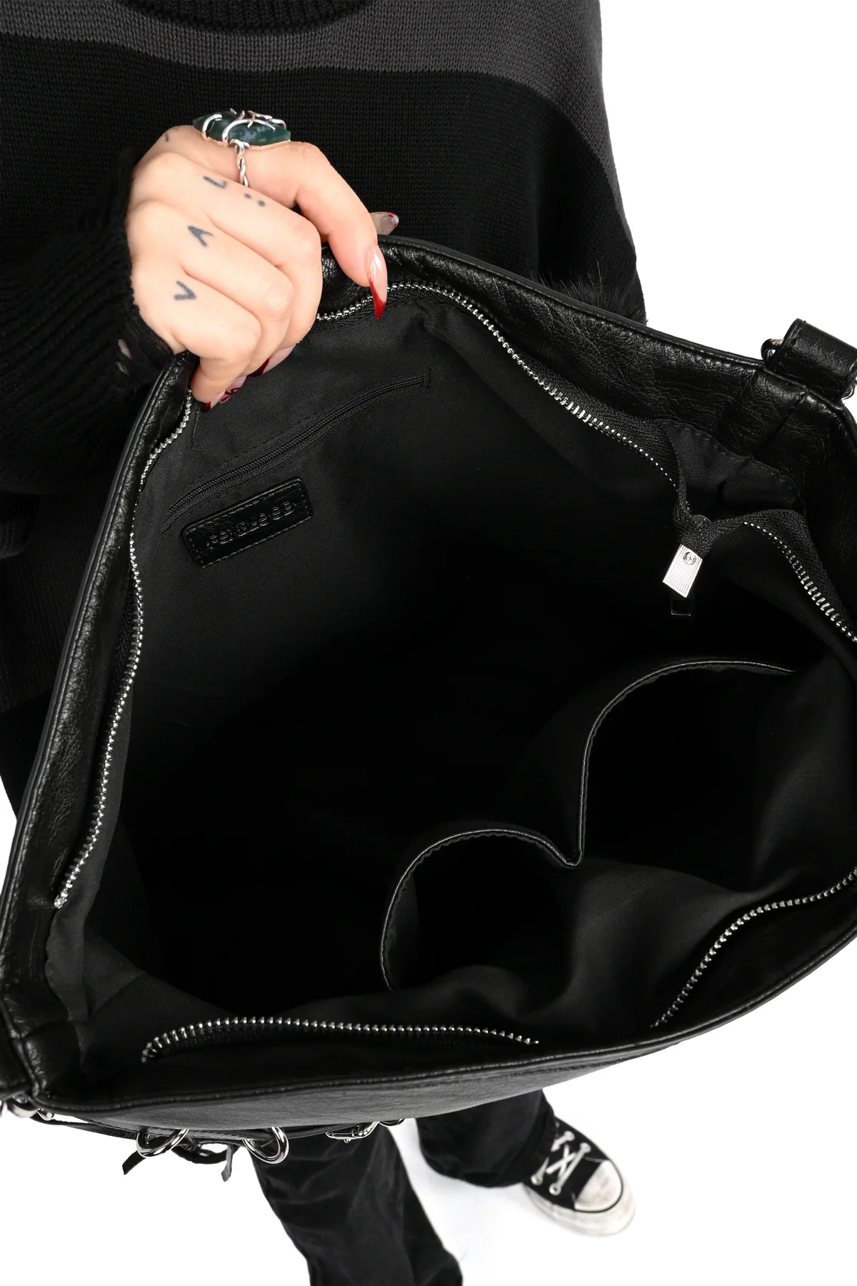 - Inside there is two open pockets and one zipper pocket.