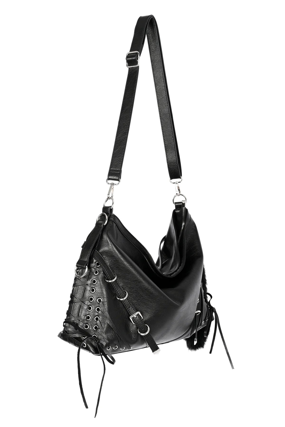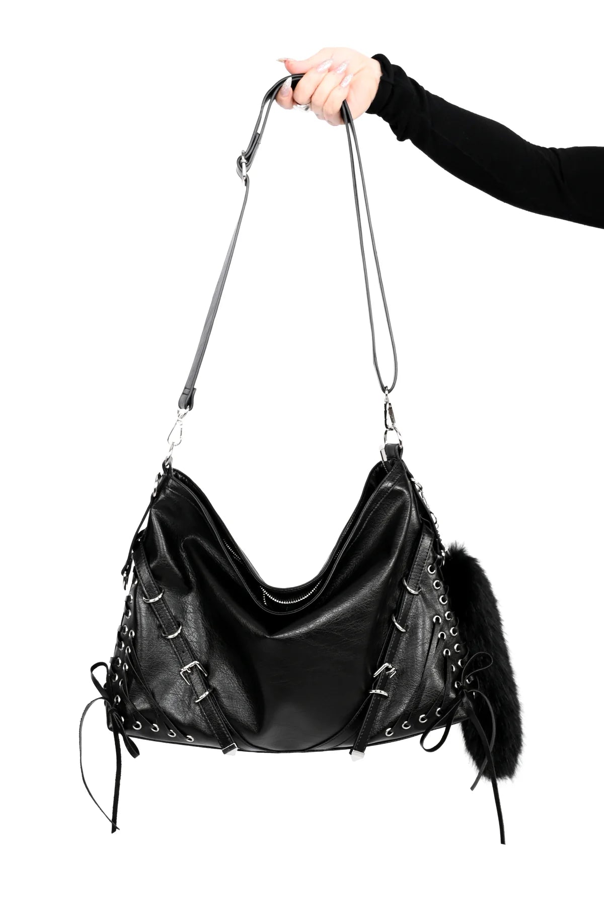 - Black faux fur tail keychain clipped to the side.