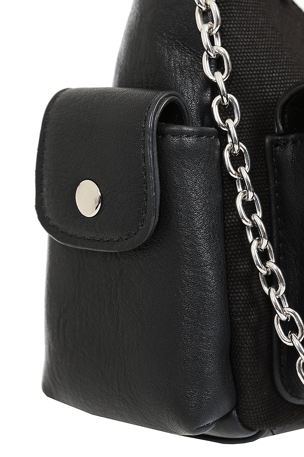 This bag is a petite size, but full of pockets, with rad details, and is the ultimate punk rock-meets-gothic inspired handbag. Its a combo of black canvas material & a vegan leather as well. You'll love the chain & charm details, all while having plenty of room for all the essentials.