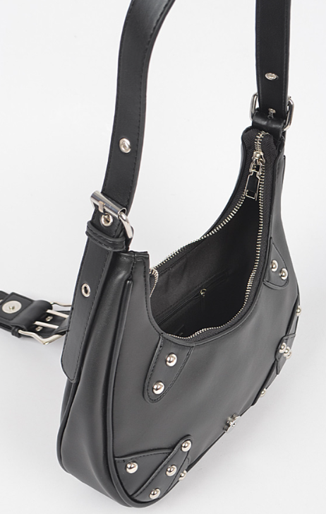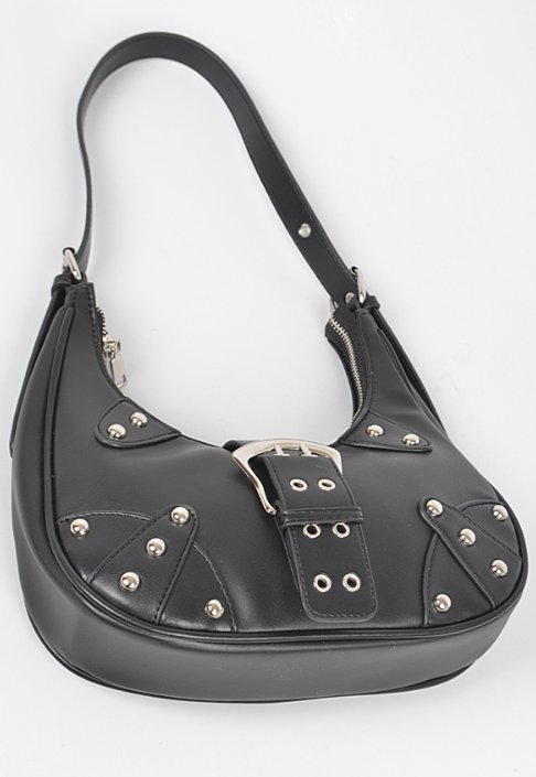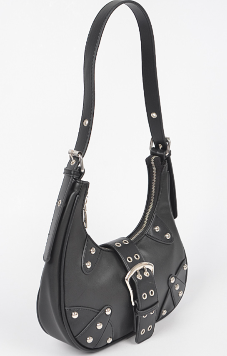 This vegan leather purse adorned with striking metal studs is not just an accessory; it's a statement piece and elevates any outfit. With its single buckle closure and comfortable shoulder strap, it offers both functionality and sass.