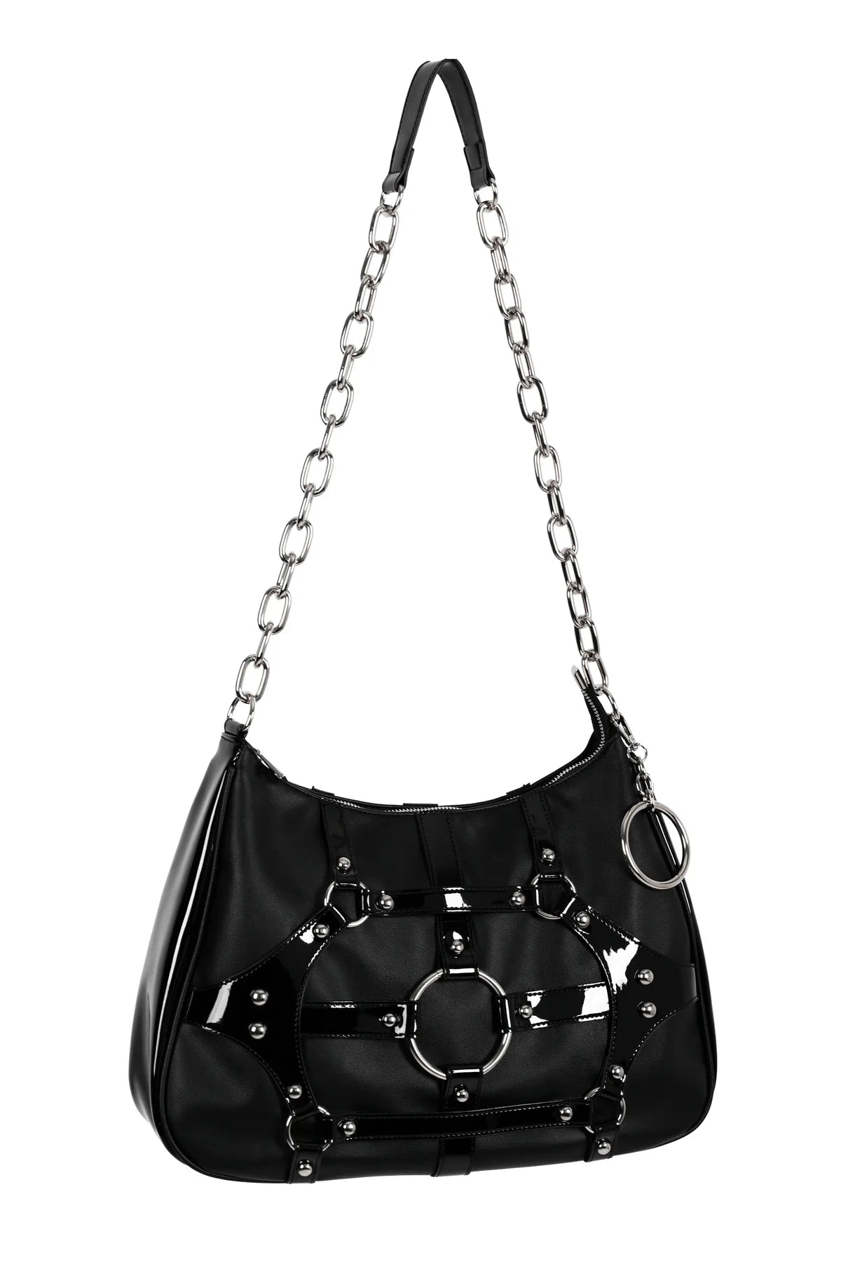 - Black PU shoulder bag with black shiny PU detailing, plus silver o-rings and hardware.