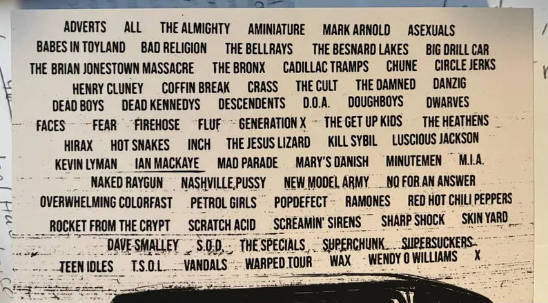 Adverts, ALL, The Almighty, aMiniature, Mark Arnold, Asexuals, Babes In Toyland, Bad Religion, The Bellrays, The Besnard Lakes, Big DRILL Car, The Brian Jonestown Massacre, The Bronx, Cadillac Tramps, Chune, Circle Jerks, Henry Cluney, Coffin Break, Crass, The Cult, The Damned, Danzig, Dead Boys, Dead Kennedys, Descendents, D.O.A., Doughboys, Dwarves, Faces, FEAR, fIREHOSE, fluf, Generation X, The Get Up Kids, The Heathens, Hirax, Hot Snakes, Inch, The Jesus Lizard, Kill Sybil, Luscious Jackson, Kevin Lyman, Ian MacKaye, MAD PARADE, Mary’s Danish, Minutemen, M.I.A., Naked Raygun, Nashville Pussy, New Model Army, No For An Answer, Overwhelming Colorfast, Petrol Girls, POPDeFECT, Ramones, Red Hot Chili Peppers, Rocket from the Crypt, Scratch Acid, Screamin’ Sirens, Sharp Shock, Skin Yard, Dave Smalley, S.O.D., The Specials, Superchunk, Supersuckers, Teen Idles, T.S.O.L., Vandals, Warped Tour, Wax, Wendy O Williams, and X.