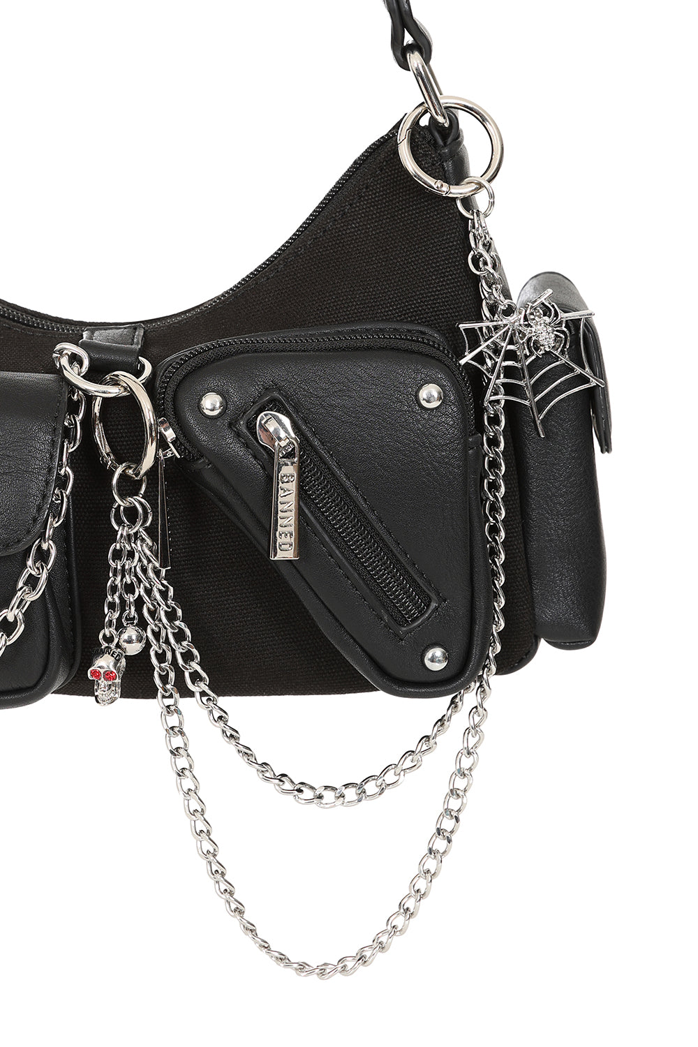 Keychain, yes! Shoe Accessory, yes! Purse Charm, duh! This versatile charm can be clipped on just about anything. Makes for a cute gift too! The Banned Web of Fate Spiderweb & Skull Double Chain is darkly intricate featuring a bold spiderweb design intertwined with skull accents