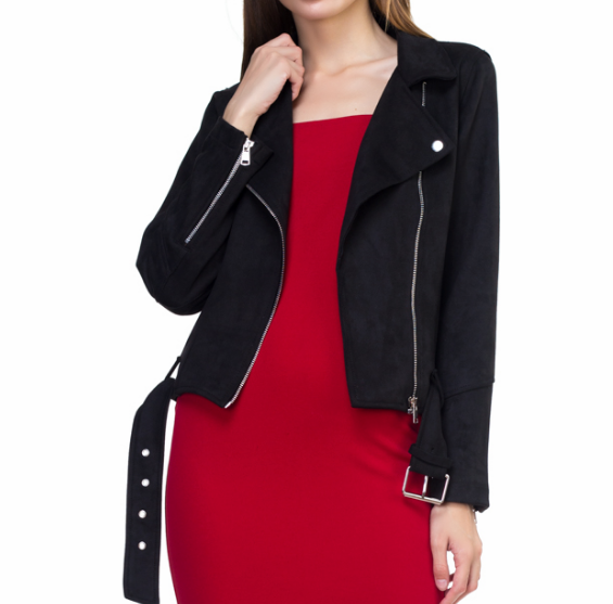 Be the baddest babe in this Black Moto Style Faux Suede Jacket. Featuring an allover faux suede design, front notched lapels, long sleeves with zip up detail, a front zip up, side slanted zipper pockets, belt loops and adjustable waist belt.