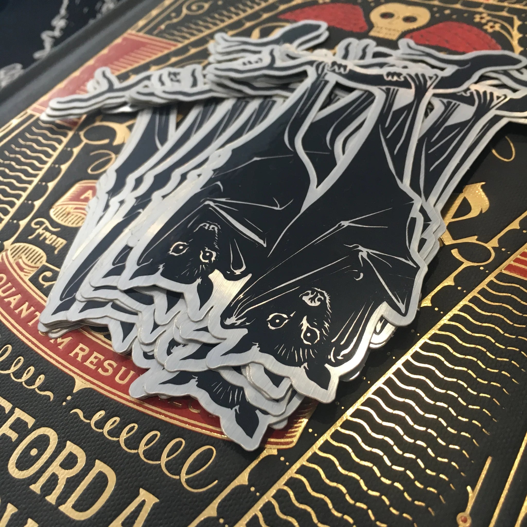 "Blood Sucking Love, Taking Flight" - Our New Nocturnal Lovers Enamel Sticker embodies a duo of one of our favorite night dwelling creatures. Hanging together approx 4.5" in length, these black bats feature shiny silver accents.